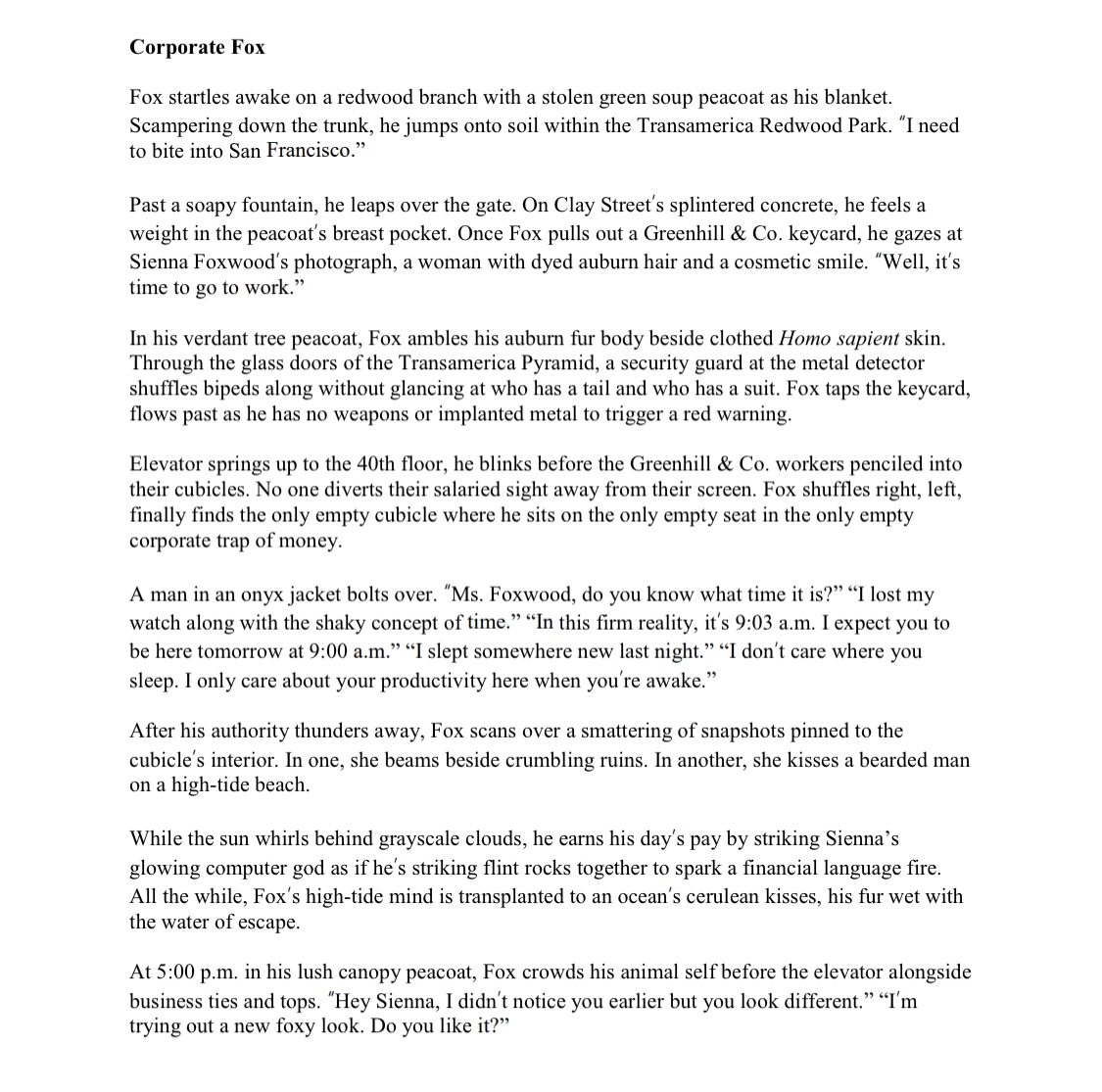 Corporate Fox Keith Gaboury March 24, 2024 Flash Fiction 0 Published in Flash Fiction Forum (2023) Post Views: 508 Share:
