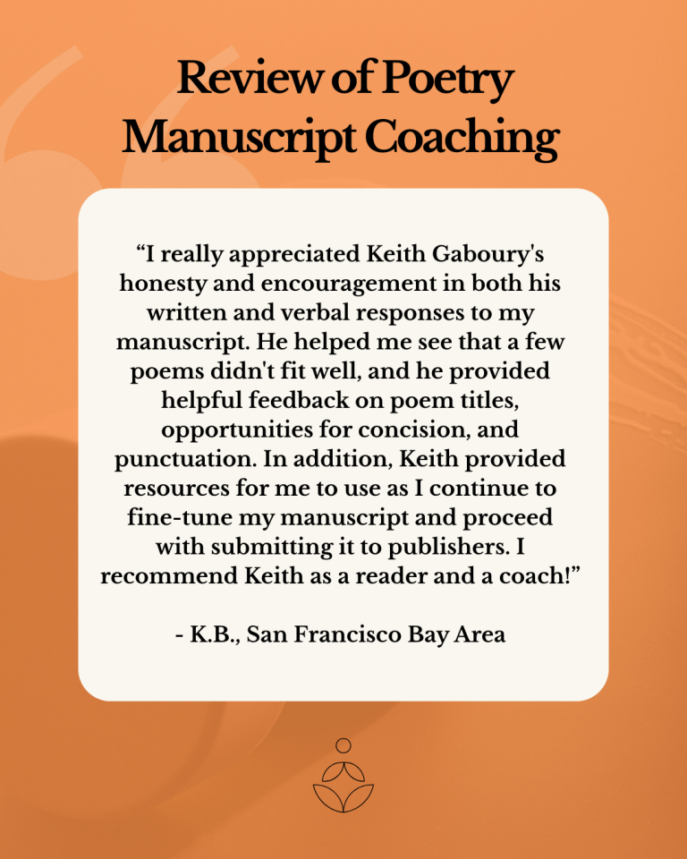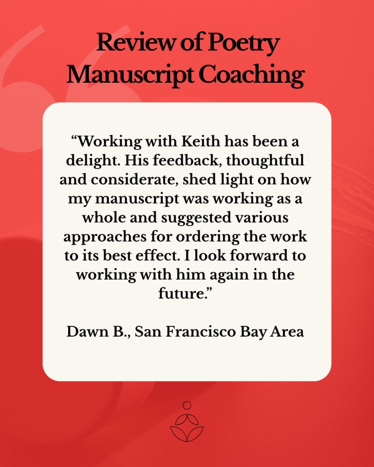 • A Manuscript Workshop to recommend a table of contents so that your poetry collection is a cohesive whole rather than standalone poems. I also provide a limited amount of revision suggestions to specific poems.